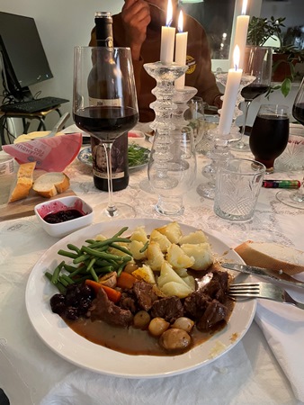 En fredag kväll var jag och en kille från jobbet bjudna på en dundermiddag hos vår mammalediga kollega. Ett halvår att ta igen, jobbskvaller och annat. Hon bjöd på Boeuf bourguignon och på det en mastig kanelbullekaka, så jäkla gott alltihop!