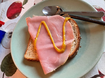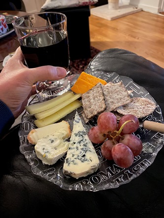 Många matbilder var det ja… Vi njuter av gin, ost och vin, diverse viktväktarmat och jag tar första mackan med julskinka på.