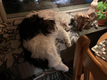 Purdy är en speciell liten misse. Pratar mycket och söker uppmärksamhet. Vill sova ovanpå en och helst bli klappad hela tiden, annars krafsar hon på munnen eller i ansiktet.