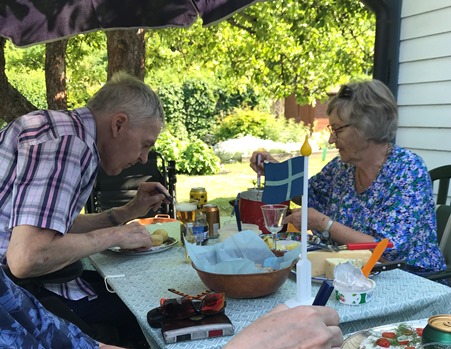 Frida och Olov tackar för flytthjälp med tacos. Olov har gjort egen salsa och allt är så gott. Islatte och kaka, mätt som en plätt.
