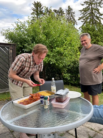 Balkongen är i stort sett färdig och vi får tillbaka handtaget så vi kan gå ut. Fram med möblerna och så dukar vi upp skaldjur och vitt vin. En klumpigare inglasning än den vi hade innan men en fördel är att man kan ställa upp fönstren lite och det känns ändå säkert för katterna så vi kan få lite drag. Vi köpte till lite finare insidor så det känns mer klätt. Katterna, nöjda med balkonghäng igen efter 2 månaders uppehåll.